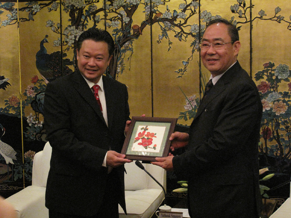 他说,今年,我们将迎来中泰建交36周年,中泰双方有着非常友好的传统友谊,应继续把“中泰一家亲”传承好,维护好,发展好。他认为,泰国是东盟的第二大经济体,是联系东南亚各国经济合作的中心,已成为中国在东南亚最亲密的伙伴之一。广东和泰国地缘相近,人缘相亲,文化相通,交往密切。长期以来,特别是近几年来,广东与泰国在经贸、旅游、高新技术、文化等领域的交流合作日益深化,合作前景广阔。2010年,广东与泰国进出口贸易170.7亿美元,同比增长32.3%,广东对泰国出口51.2亿美元,同比增长50.6%,广东从泰国进口119.4亿美元,同比增长25.7%。