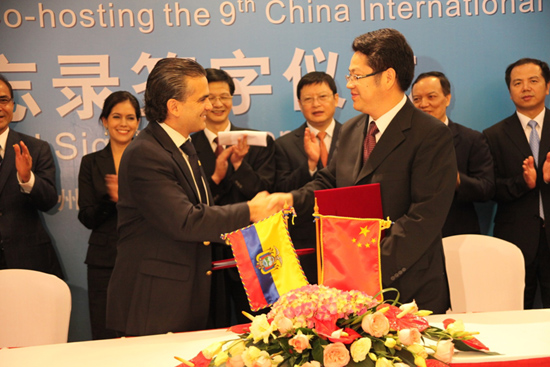 2012年4月26日,中厄联合主办第九届中国国际中小企业博览会备忘录签字仪式在广州举行。厄瓜多尔将作为联合主办国之一与中方联合举办第九届中博会。中博会组委会副主任兼执行主任、广东省副省长,厄瓜多尔外交商务统筹副部长法兰斯克·里巴德尼亚出席签字仪式并致辞。中博会组委会秘书长、省政府副秘书长林英主持了签字仪式。中博会组委会副秘书长、省经济和信息化委员会主任杨建初,省外办李坚副主任,中博会组委会秘书处副主任、省中小企业局局长张文献,南方航空股份有限公司何宗凯副总经理,省贸促会张华副会长见证了备忘录的签署。