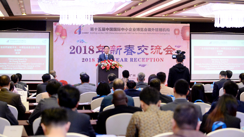 1月23日,第十五届中国国际中小企业博览会(下称“中博会”)境外驻穗机构推介暨新春交流会在广州举行。中博会组委会秘书长、广东省政府副秘书长钟旋辉出席并致欢迎辞,中博会组委会秘书处副主任、工业和信息化部中小企业局副局长叶定达,中博会组委会秘书处副主任、广东省中小企业局局长姚德洪,阿拉伯联合酋长国经济部驻华商务处全权公使巴德尔·穆沙利赫、广东省外事办公室、广东省贸促会相关领导参加会议。交流会由广东省中小企业局副局长、中博会事务局局长何佐贤主持。