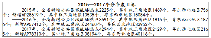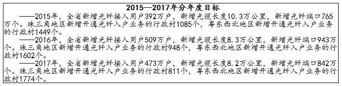 2017年底前,我省各主要宽带指标进入全国先进行列,珠三角地区建成全国首个宽带城市群,粤东西北地区固定宽带接入能力快速提升。