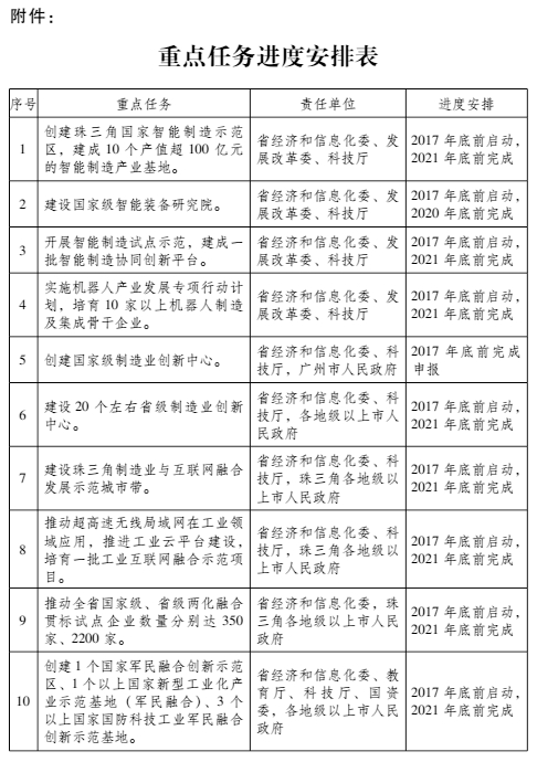 (一)创建珠三角国家智能制造示范区。推进智能制造示范基地建设,开展智能制造试点示范。建设一批具有国际先进水平的智能制造协同创新平台,构建智能制造自主创新体系,建设国家智能制造技术标准创新基地。支持广州、佛山市建设国家级智能装备研究院,在顺德区建设智能制造科技产业园,支持惠州市与中国信息通信研究院、赛迪研究院分别合作建设华南创新基地、赛迪华南智能制造创新中心。实施机器人产业发展专项行动,发布机器人产业发展技术攻关和标准体系规划与路线图。到2021年,珠三角地区培育10家以上机器人制造及集成骨干企业,建成10个产值超100亿元的智能制造产业基地。(省经济和信息化委、发展改革委、科技厅、质监局,珠三角各地级以上市人民政府)