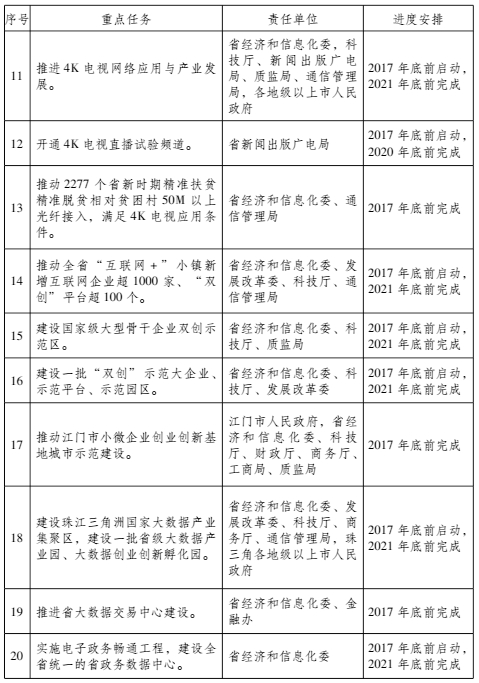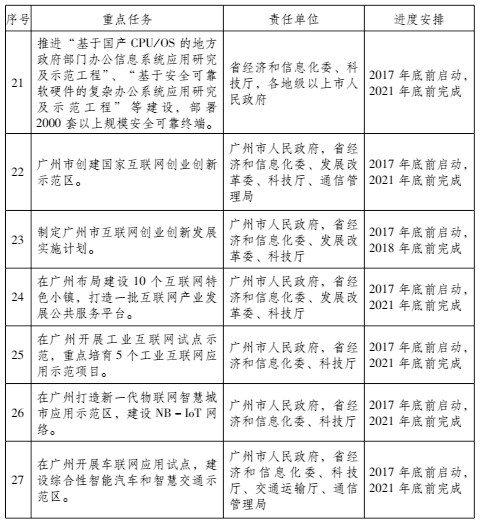 (十一)支持广州市创建国家互联网创业创新示范区。广州市制定互联网创业创新发展实施计划,大力发展物联网、人工智能等互联网核心技术,推动互联网应用服务创新,创建国家互联网创业创新示范区。2021年前,基本建成“一核”(琶洲互联网创新集聚区)、五大千亿级产业基地(高唐泛娱乐产业基地、花地河互联网商务产业基地、新造智慧产业基地、中新知识城大数据产业基地、南沙跨境数据服务产业基地)、10个互联网特色小镇。(广州市人民政府,省经济和信息化委、发展改革委、科技厅、通信管理局)