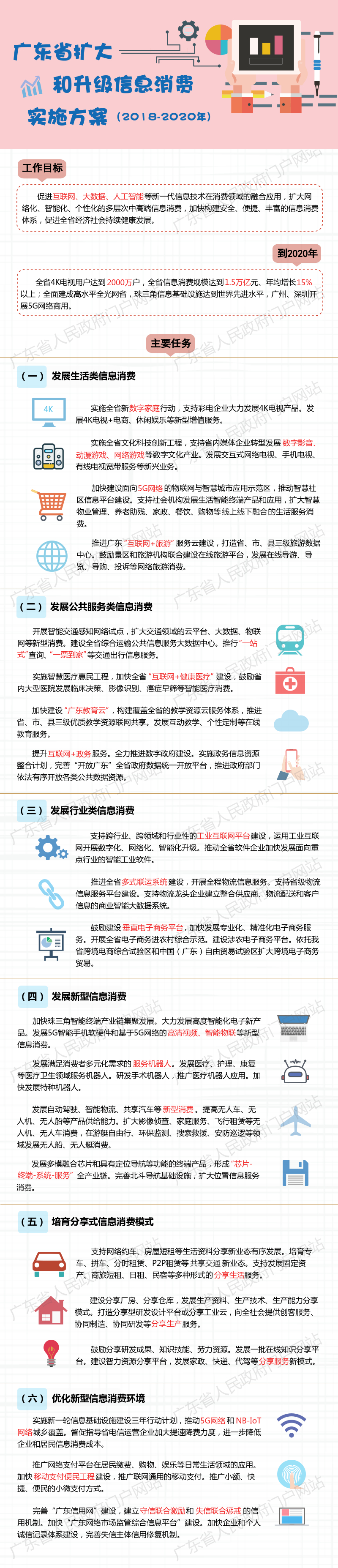 促进互联网、大数据、人工智能等新一代信息技术在消费领域的融合应用,扩大网络化、智能化、个性化的多层次中高端信息消费,加快构建安全、便捷、丰富的信息消费体系,促进全省经济社会持续健康发展。到2020年,全省4K电视用户达到2000万户,全省信息消费规模达到1.5万亿元、年均增长15%以上;全面建成高水平全光网省,珠三角信息基础设施达到世界先进水平,广州、深圳开展5G网络商用。
