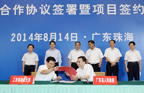 14日,部省共同推进珠江西岸先进装备制造产业带发展暨项目签约仪式在珠海举行,苗圩(左)、朱小丹(右)代表工业和信息化部、广东省政府签署合作协议。