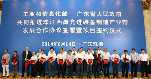 会上,苗圩、朱小丹代表工业和信息化部、广东省政府签署共同推进珠江西岸先进装备制造产业带发展合作协议。据悉,到2017年在珠江西岸形成以智能制造、汽车制造、轨道交通、海洋工程、航空制造、节能环保、新能源装备、卫星及应用等为重点的特色优势产业集聚区。珠江西岸五市一区39个项目现场签约,投资总额达1050.9亿元。